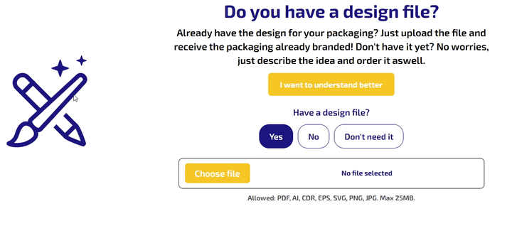 Upload your design if you have it. If you don’t, describe what you want on the packaging so we can prepare the branded result correctly.